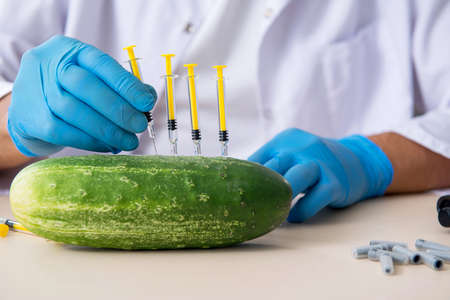 A man injects chemicals into a cucumber, fertilizers and chemicals with a syringe to increase the shelf life of vegetables. Chemical processing of vegetables, injection with chemicals.