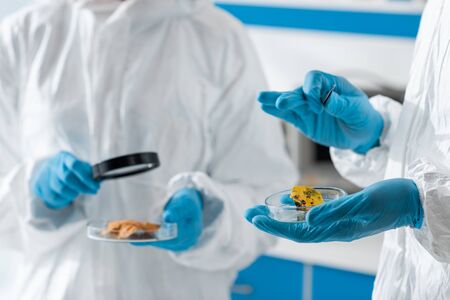 cropped view of biologists analyzing and looking at leaf with magnifying glass