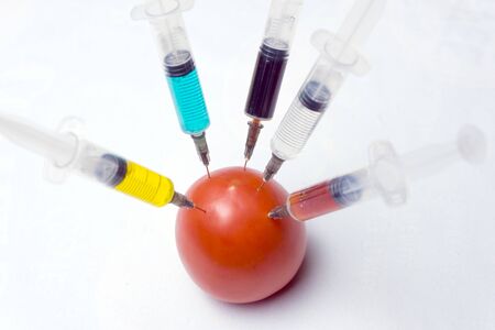 Syringes with green, red, yellow, black and white liquid make an injection into a red tomato on a white background. Concepts of genetic modification.
