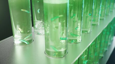 3D Illustration biofuel oil research in the laboratory, biofuel concept. Bacteria in the liquid inside the test tube as fuel. Biotechnology. Glassware flasks. Laboratory research concept. Test tubes