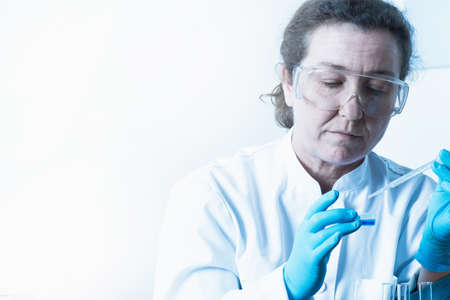 Close-up young chemist, doctor conducts chemical research isolated on blue background. Concept of pharmacology.