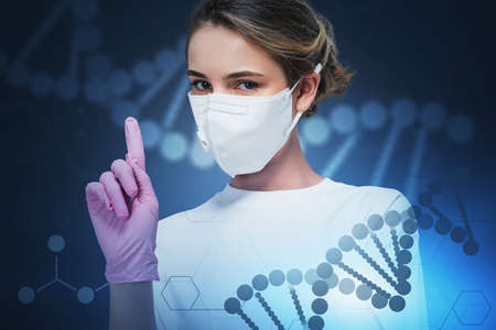 Young woman in protective mask and gloves standing over dark blue background with 2019 ncov around her and double exposure of DNA chain