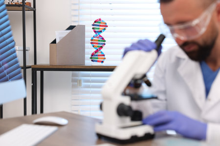 Scientist analyzing genetic samples under microscope in laboratory with dna helix graphic