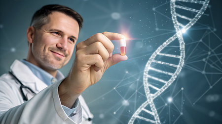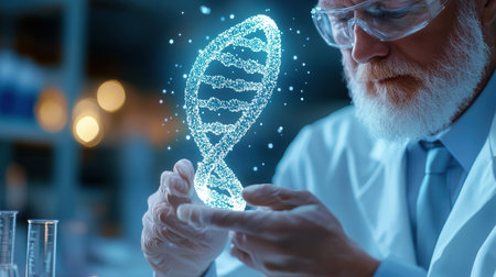 Scientist analyzing holographic DNA strands, modern lab environment, cool blue tones, medium shot, focused lighting