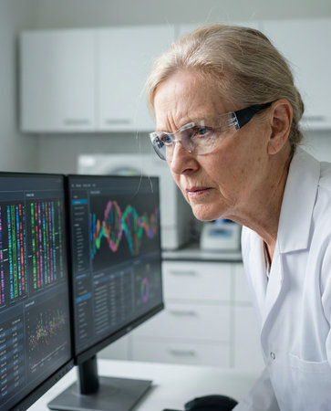 A focused senior scientist wearing a lab coat and safety glasses intently examines genetic data on dual computer monitors in a modern laboratory setting. Image is generated using AI.