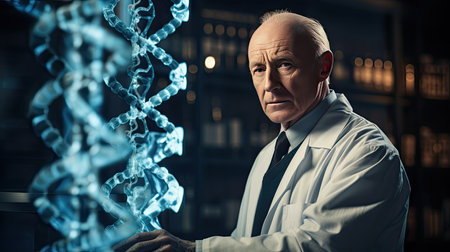 A man in a lab coat is looking at a DNA strand. Concept of curiosity and scientific exploration