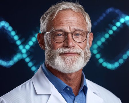 A senior scientist studies DNA double helix models in the lab highlighting their expertise and curiosity in genetics.