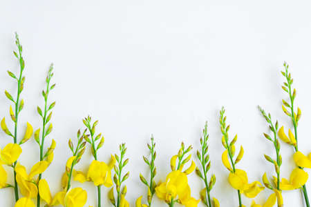 Yellow blossom gorse on the white background. Flat lay floral themes, space for text