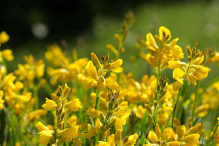 many yellow flowers of genista in a field