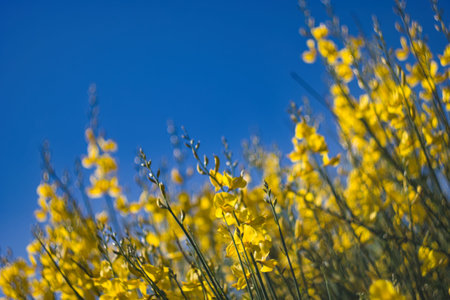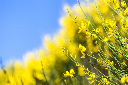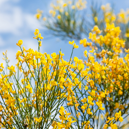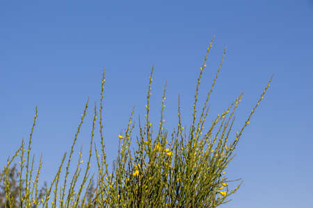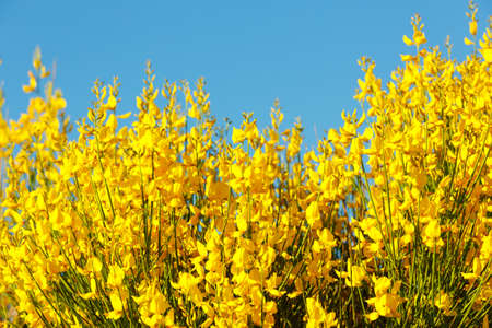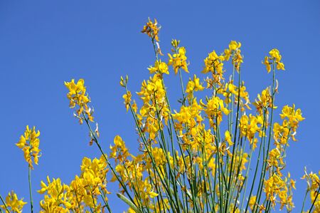 Yellow Spanish Broom (Spartium junceum), mediterranean region in France, on blue sky background