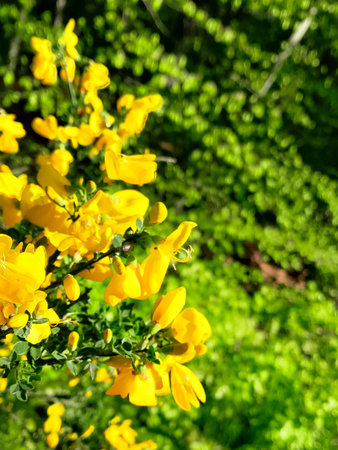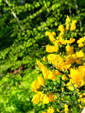 Bright yellow petals of Scotch Broom are showcased amidst an abundant backdrop of greenery capturing the essence of spring's beauty and growth.
