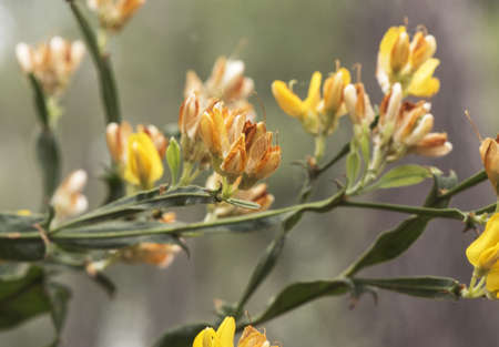 Pterospartum tridentatum legume with shrubby growth with flattened stems, thorny flowers of intense reddish yellow color blurred background light by flash