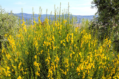 A large bush of flowering yellow gorse (Spartium junceum) against the backdrop of picturesque Italian hills.