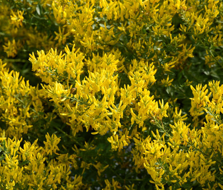 Genista hirsutum mediterranean needle leaved and flax broom thorny shrub with deep yellow flowers clothed as small tufts light by flash