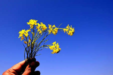 Beautiful yellow flowers of mustard in hand. Blue sky in the background. selective focus.