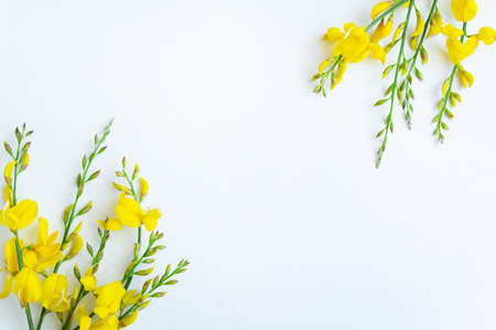 Yellow blossom gorse on the white background. Flat lay floral themes, space for text