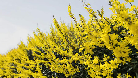 A stunning display of bright yellow flowers against a clear blue sky, capturing the essence of spring and the beauty of nature in vibrant colors.