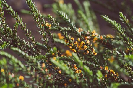 eutaxia obovata (also called egg and bacon plant) with green spiky leaves and yellow flowers, shot at shallow depth of field