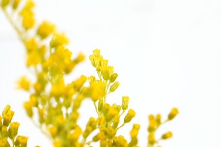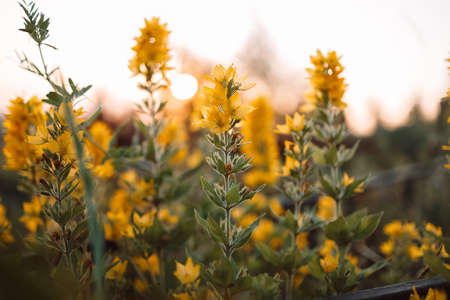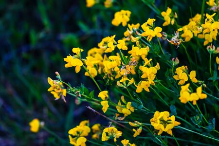 Close up of wild yellow and small flowers outdoor in sunlight,