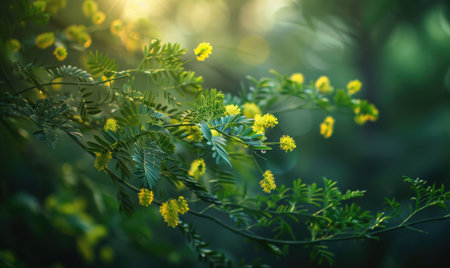 Closeup view of yellow mimosa flower branch with bokeh background