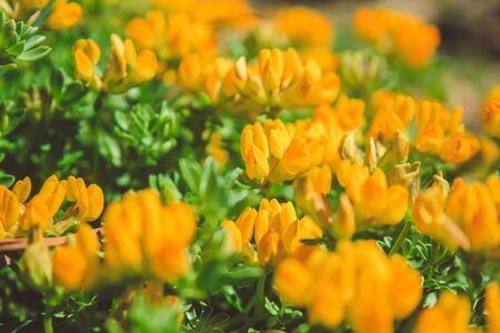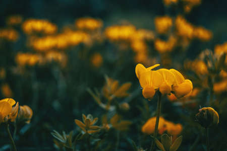 Beautiful fairy dreamy magic yellow flowers with dark green leaves in flowerbed, toned with instagram filters in retro vintage style effect, soft selective focus, blurry background, copyspace for text