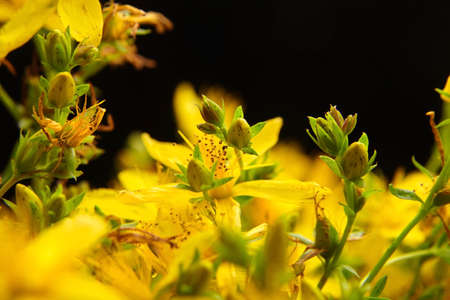 Hypericum perforatum or St Johns wort blooming flowers, closeup on black background, selective focus