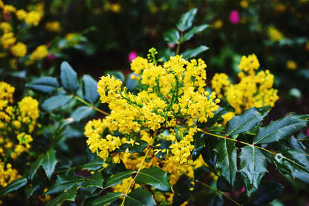 Blooming Magonia. Beautiful yellow flowers. Wet leaves after the rain. Close-up, macro, selective focus