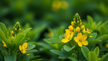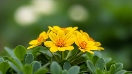 Leaves showing close-up of vibrant yellow flowers with green leaves and blurred background in soft natural light....
