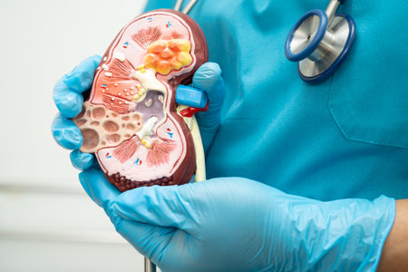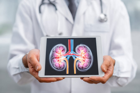 Medical professional holds a tablet displaying a detailed kidney diagram to explain anatomy and functions in a clinical environment