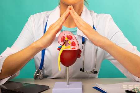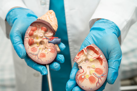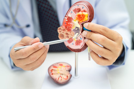 Healthcare professional holds kidney model to explain organ functions during a medical consultation in a clinic setting