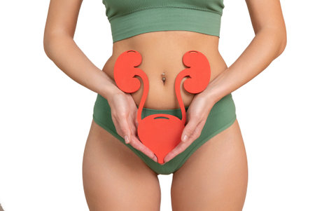 illustration of bladder and kydneys detox with highlighted organ and contrast hands on dark background. Low key photo with copy space toned in dark green colors. Medical concept design template