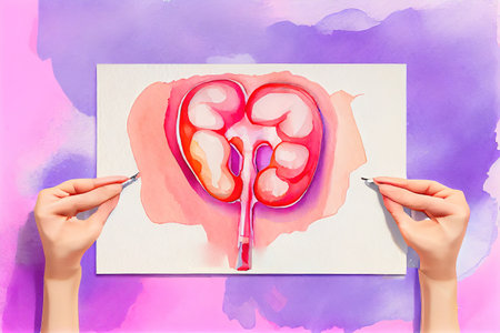 A colorful drawing of a kidney with pink, blue, and purple colors. The drawing is abstract and creative, with a focus on the shape and form of the kidney