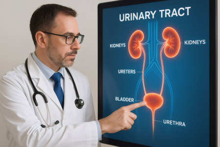 Doctor pointing at bladder on interactive display showing human urinary tract, kidneys, ureters, bladder and urethra