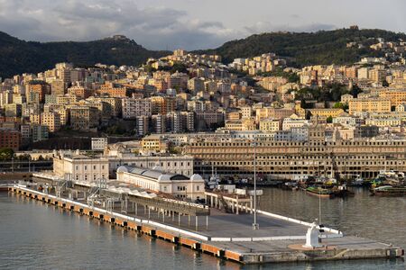 Genoa, Italy - September 24, 2018: View from the top to the seaport of Genoa, big ships and houses. Amazing landscape, blue sky and sea. Summer time