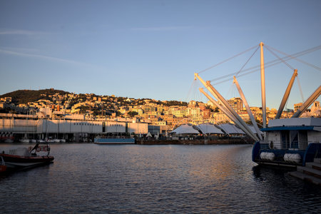 Genoa, Italy - October 30, 2016: Panoramic view of port in Genoa, one of Europe's largest cities on the Mediterranean sea and the largest seaport in Italy.