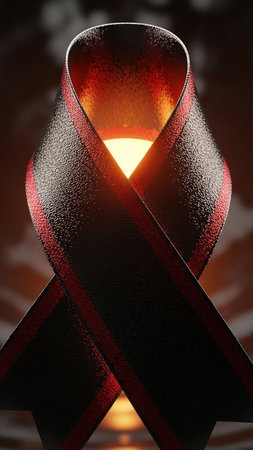 A black ribbon with red stripes tied in a bow shape, dramatically lit from within by a bright golden light against a dark textured background.