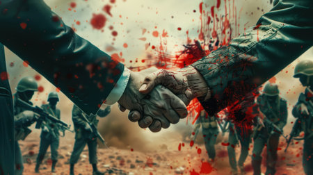 Businessmen handshake illustration. Blood, war and soldiers on the background. Bloody politics concept. AI Generated