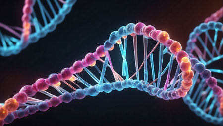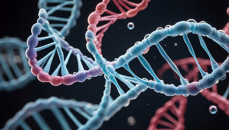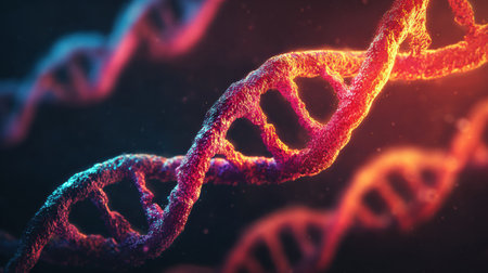 A close-up illustration depicts a DNA double helix in a vibrant color scheme. The composition features a blue and red color palette, with blurred elements in the background. This image could be used in scientific publications, educational materials, or promotional content related to biotechnology and research.