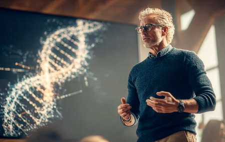 Professor gesturing while explaining dna structure during university genetics lecture