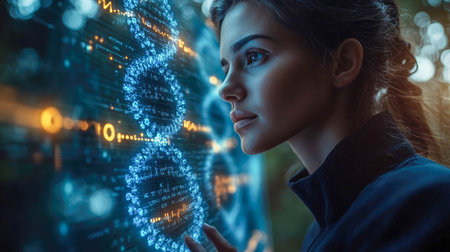 A female scientist in a lab coat analyzing a glowing digital DNA structure on a futuristic display. Genetic research and biotechnology concept.