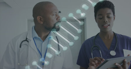 Image of dna strand over african american female and male doctor with tablet talking in hospital. Medical and healthcare services concept digitally generated image.