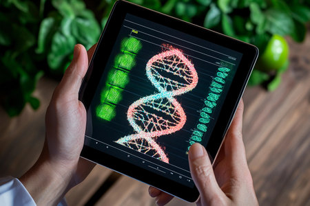 A user interacts with a tablet displaying a digital representation of a DNA double helix. This image symbolizes the fusion of technology and genetics.