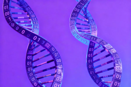 Blue and white DNA helix under a virtual microscope view with side data panels