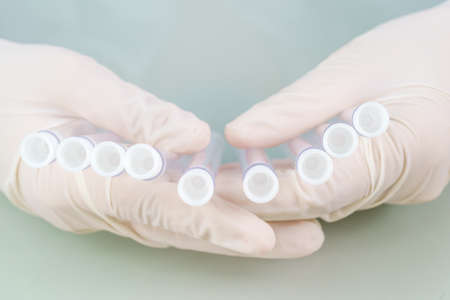 Tripods with test tubes in the hands of a laboratory assistant. Development of a new vaccine. A vaccine against Covid 19. Clinical and diagnostic laboratory.An unrecognizable person. Only hands with protective gloves.