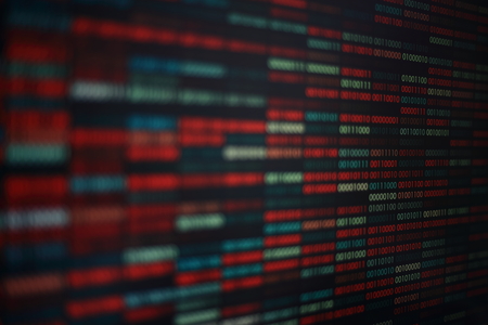 Computer virus infection. Row of binary codes randomly colored red and blue on black screen monitor background. Corrupted computer data bad sector hard disk visualization.