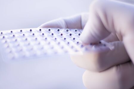 Laboratory test plate. hands with 96 well microplate. medical or microbiological test of blood or dna. test of cancer or virus