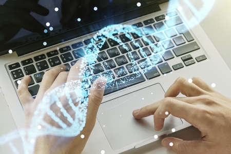 Man typing on laptop with DNA helix hologram screen over keyboard. Genetics, biology, science and molecular technology concept. Hand camera shake.