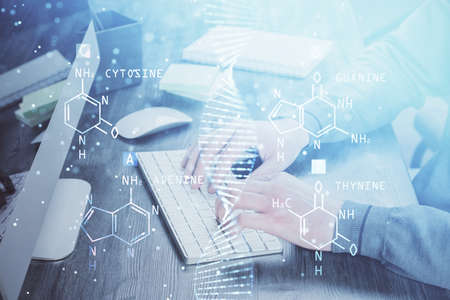 Double exposure of mans hands typing over computer keyboard and DNA hologram drawing. Top view. Medical education concept.