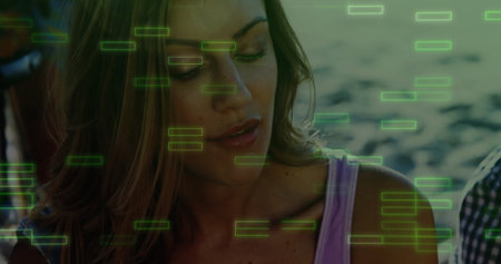 Scanning mid adult woman in sleeveless top gazing downward at waterfront, with green data overlays. Futuristic, technology, waterscape, digital, interface, serenity, relaxation