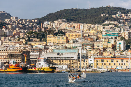 Genoa, Italy - September 22, 2024: Colorful hillside buildings and tugboats line the busy port with mountains rising in the background.
